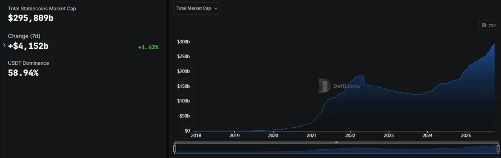 Согласно Defi Llama, Tether сохраняет доминирование с долей рынка почти 59%.