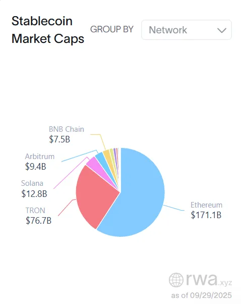 Сеть Ethereum остается основной для стейблкоинов — в ней выпущены активы стоимостью в $171 млрд. На втором месте TRON с $76 млрд. В сетях Solana, Arbitrum и BNB Chain суммарно размещено около $29,7 млрд.
