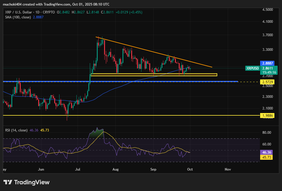 На дневном графике цена XRP формирует нисходящий треугольник с момента достижения своего пика в июле. Этот альткоин с высокой капитализацией, чья полная разводнённая оценка составляет около 285 миллиардов долларов, вновь тестирует важный уровень поддержки в районе 2,7 доллара, который должен удержаться, чтобы предотвратить дальнейшую коррекцию.