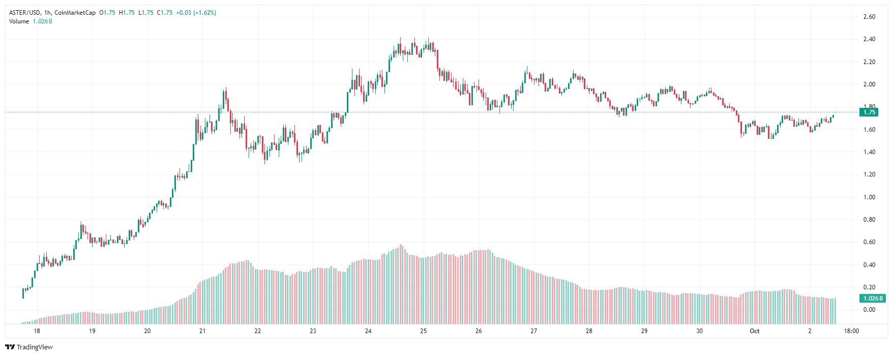 Участники рынка ждут новой вспышки роста ASTER на фоне новости. По их мнению, запуск торгов на споте Binance станет мощным катализатором позитивного движения для курса криптовалюты. Максимум стоимости монеты зафиксирован 24 сентября 2025 года на уровне $2,42. На момент написания обзора, криптовалюта торгуется на 27% дешевле.
