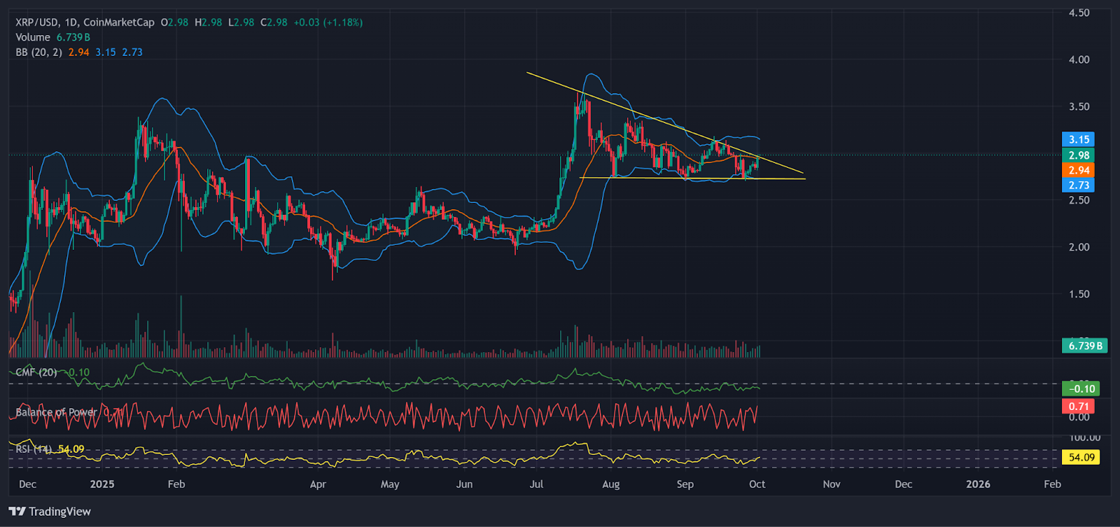 Дневной график XRP показывает, что токен торгуется в рамках нисходящей треугольной формации, а сопротивление усиливается вблизи уровня $3,00.