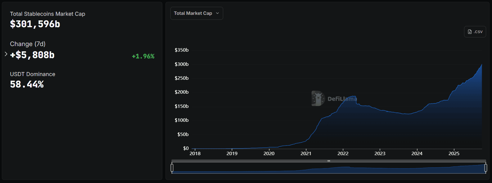 3 октября 2025 года капитализация сектора стейблкоинов достигла, а затем и превысила отметку в $300 млрд впервые в истории, согласно DeFiLlama. Лидером остается USDT, эмитентом которого выступает компания Tether, с долей в 58,4%.