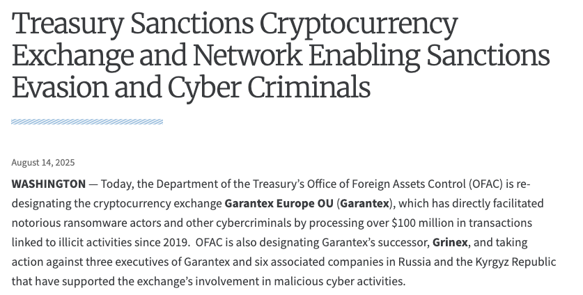 Рисунок 1. Министерство финансов США объявило о санкциях против Garantex и связанных с ней организаций 14 августа 2025 года. Источник: Treasury.gov.