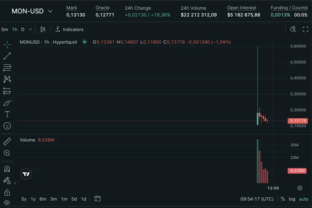 В первые часы после запуска рынок MON на Hyperliquid объем торгов составил $22,2 млн, а открытый интерес превысил $5 млн. На момент написания токен торгуется у отметки $0,15 при полностью разводненной оценке проекта в $15 млрд.