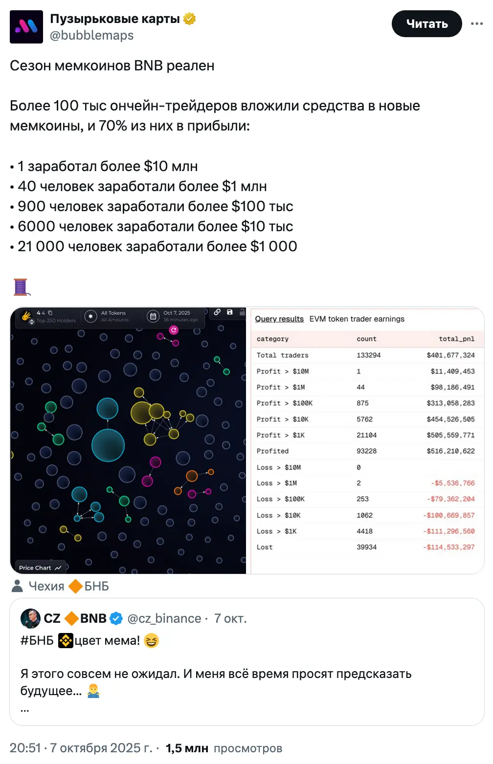 Чанпэн Чжао — далеко не единственный, кто извлек выгоду из роста BNB на рынке. По данным аналитической платформы Bubblemaps, не менее 70% трейдеров BNB Chain в настоящее время получают прибыль, а 40 трейдеров зарабатывают по $1 млн каждый.