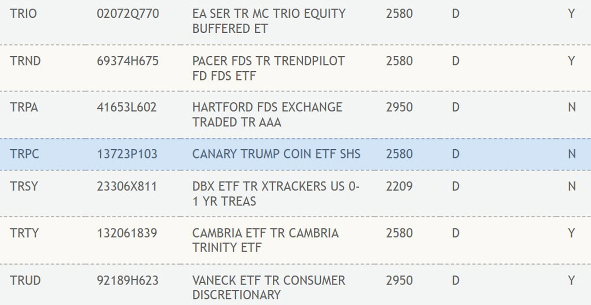Спотовый TRUMP COIN ETF от компании Canary Capital был включен в систему расчетов и клиринга Depository Trust & Clearing Corporation (DTCC). В списке продукт фигурирует под тикером TRPC.