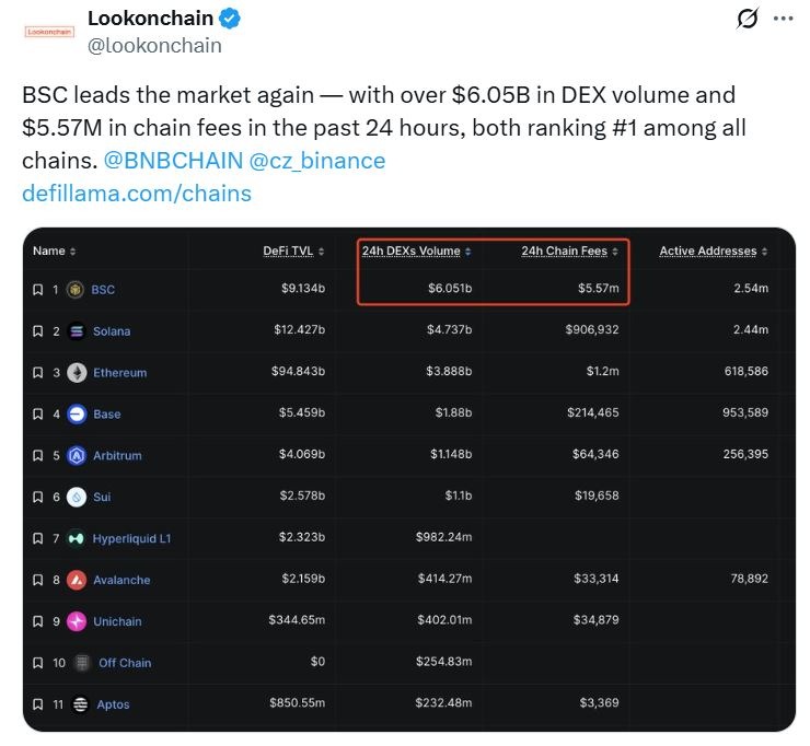 По данным платформы аналитики блокчейнов Lookonchain, BNB Chain лидирует на рынке по объему децентрализованных бирж (DEX), который составляет более 6 000 000 000 долларов, а комиссий в сети зафиксировано 5 570 000 долларов.