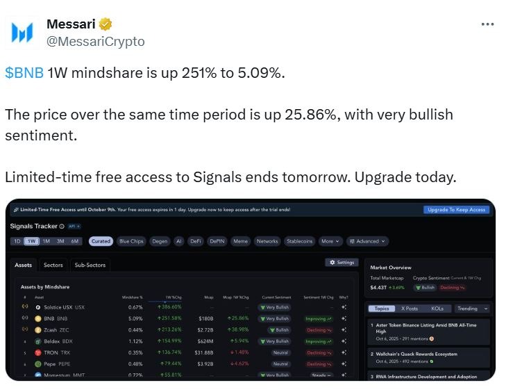 Аналитическая компания Messari, специализирующаяся на криптовалютном рынке, сообщила в своем посте X в среду, что «уровень интереса» к BNB, отражающий общественное внимание, обсуждения и узнаваемость, вырос на 251% до 5,09% за последние семь дней, при этом рост цены сопровождался «очень оптимистичными настроениями».