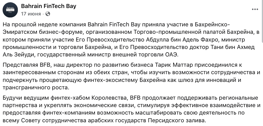 В июне BFB также приняла участие в Бахрейнско-эмиратском бизнес-форуме, организованном Торгово-промышленной палатой Бахрейна. Руководитель BFB Тарик Маттар выступил на мероприятии, чтобы обсудить развитие финтеха в Бахрейне.