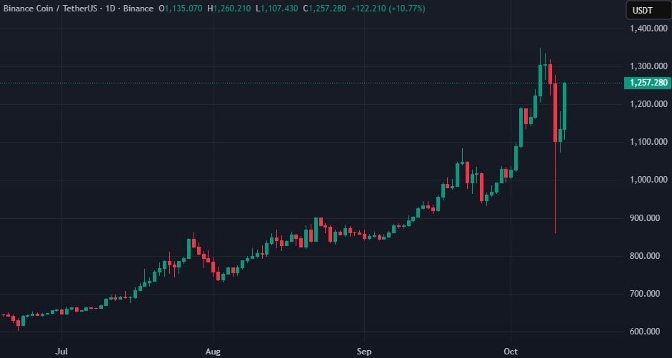 Отметим, в момент краха крипторынка 11 октября 2025 года курс BNB падал до $860, однако впоследствии быстро восстановился. На момент написания актив торгуется выше отметки в $1250: