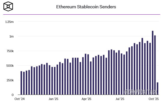 Особенно показательно то, что в последние две недели активность пользователей достигла исторической отметки — свыше 1 000 000 уникальных отправителей стейблкоинов в неделю. Это означает, что за очень короткий срок Ethereum привлек сотни тысяч новых участников, использующих сеть преимущественно для транзакций в стейблкоинах.