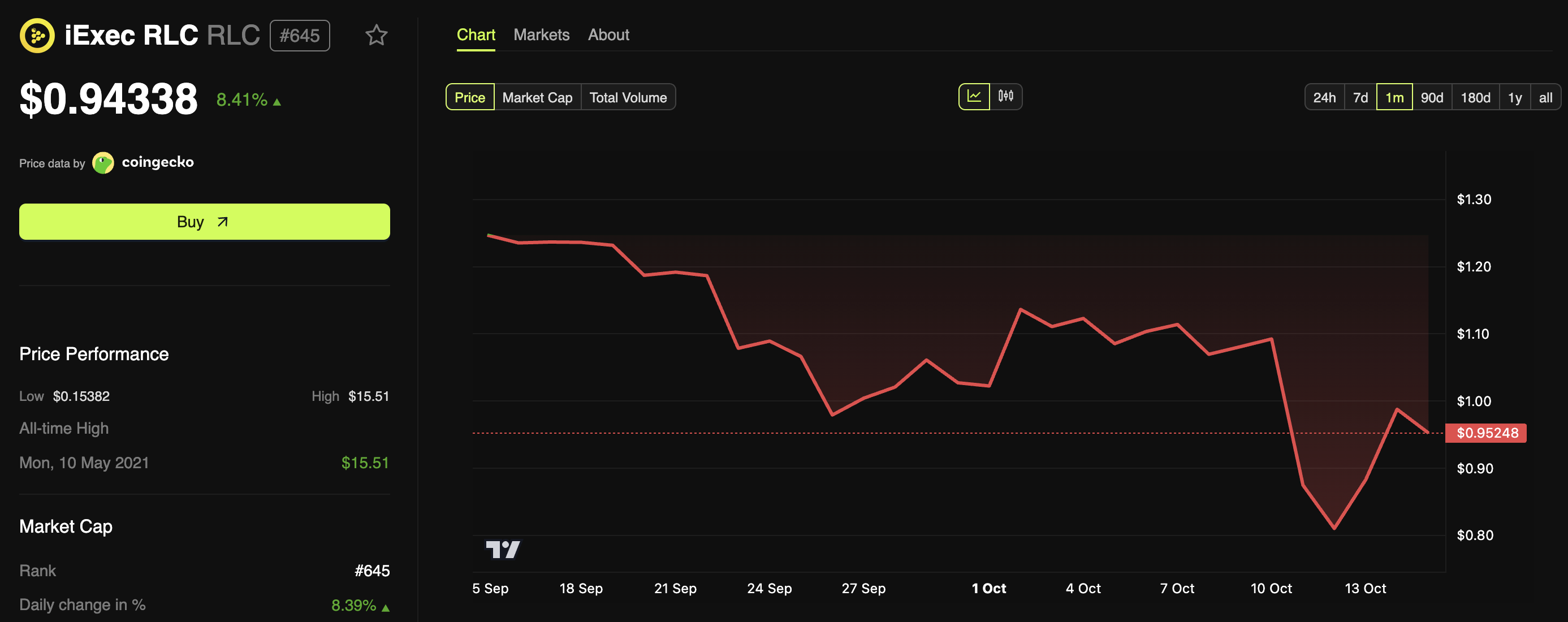 Кроме того, за последний день стоимость RLC увеличилась на 8,41%. На момент публикации монета торгуется по $0,94.