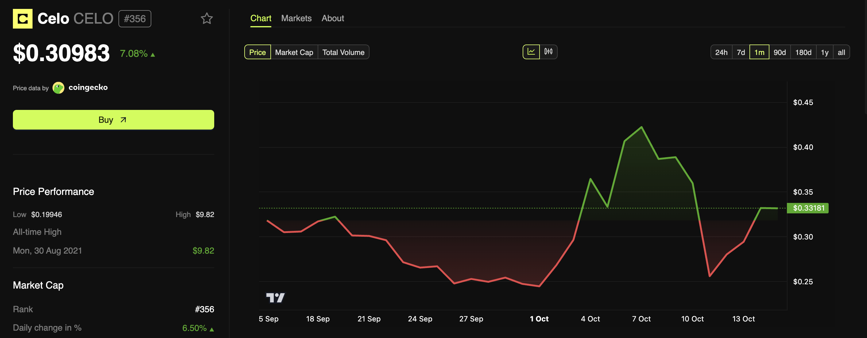 CELO растет на фоне тренда на анонимные монеты. Альткоин поднялся до $0,30, что эквивалентно росту на 7,08% за день.