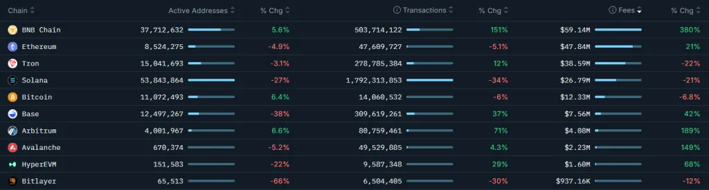 За последние 30 дней количество транзакций в BNB Chain превысило 500 млн — рост на 151% по сравнению с предыдущим периодом. По этому показателю блокчейн уступает только Solana с 1,8 млрд операций.