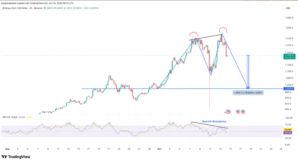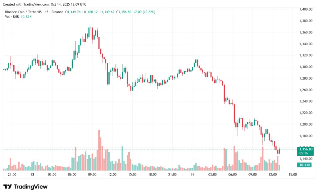За последние сутки цена BNB упала на 9,7%, до $1158. От пикового значения актив скорректировался на 16%, согласно CoinGecko.