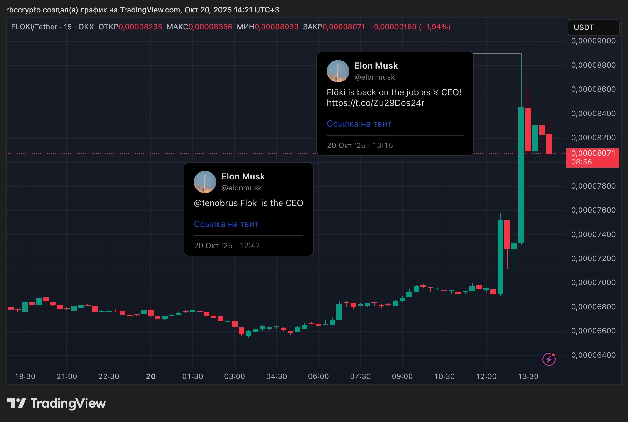 Мемкоин Floki (FLOKI) взлетел в цене почти на 30% после упоминания Илоном Маском своей собаки породы сиба-ину по прозвищу Флоки. Резкий рост токена начался после того как владелец Tesla и SpaceX напомнил, что его питомец занимает должность генерального директора соцсети X.