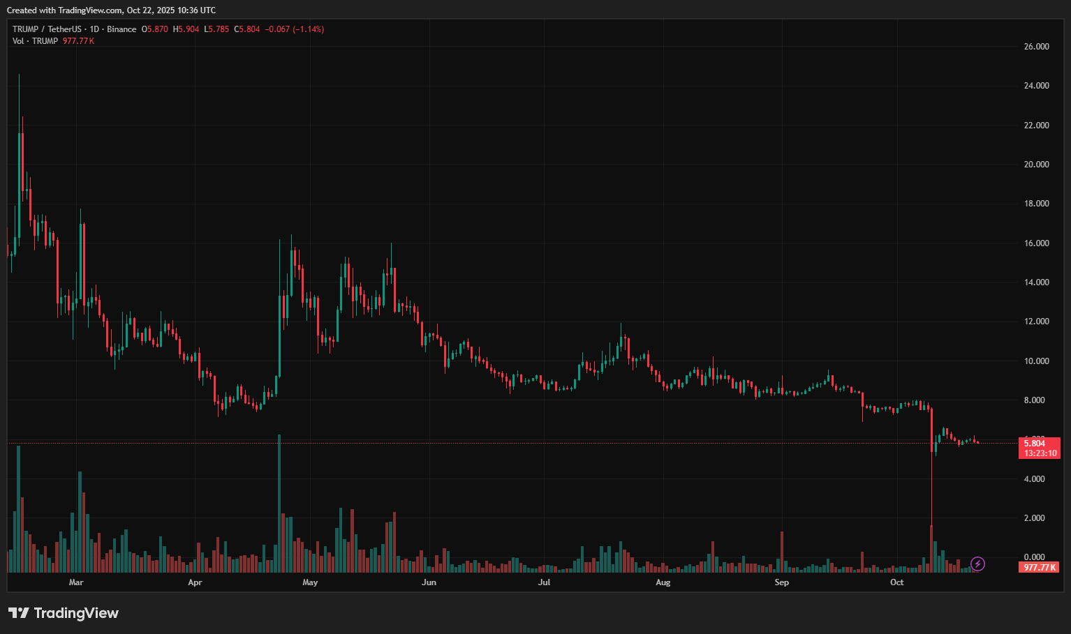 Мемкоин под тикером TRUMP, связанный с семьей политика Дональда Трампа, показал значительное снижение стоимости с момента достижения исторического максимума. Рыночная капитализация актива обвалилась почти на 91% за прошедшие девять месяцев, по данным TradingView.