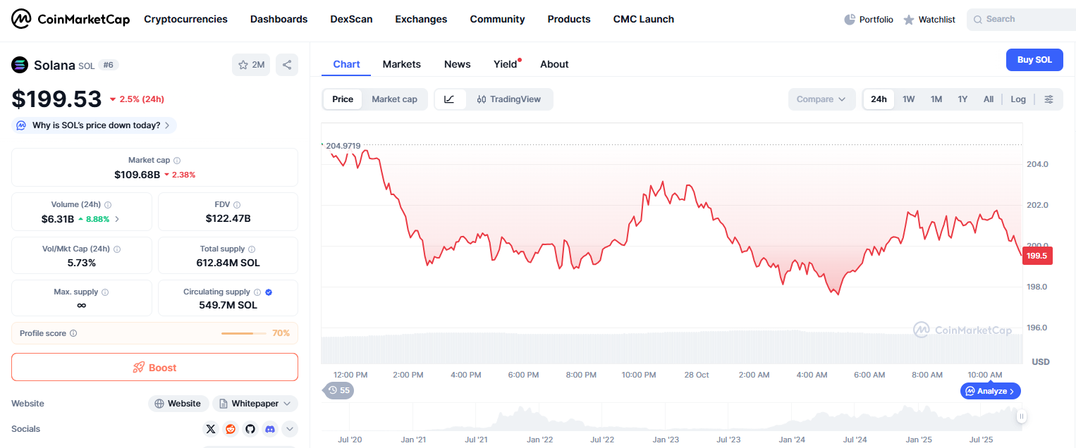 Рыночная динамика акций Solana отражает этот укрепляющийся институциональный настрой и возобновившийся оптимизм. За последнюю неделю цена выросла более чем на 8%, приблизившись к психологически важной отметке в 200 долларов, и в настоящее время торгуется около 199,50 долларов.