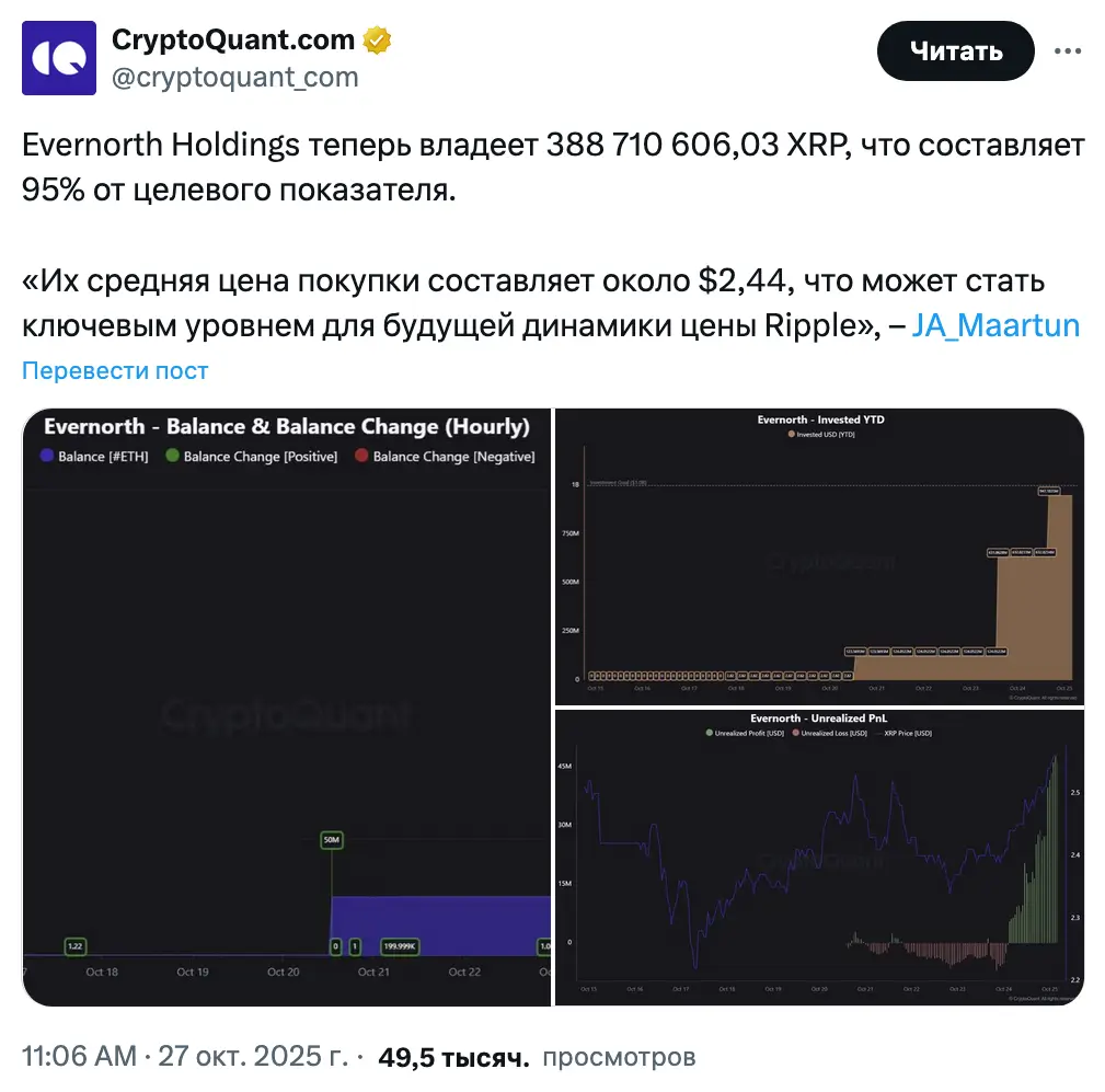 По данным на понедельник, запасы XRP у Evernorth составили 388,7 млн токенов, согласно информации с платформы для анализа цифровых активов CryptoQuant.