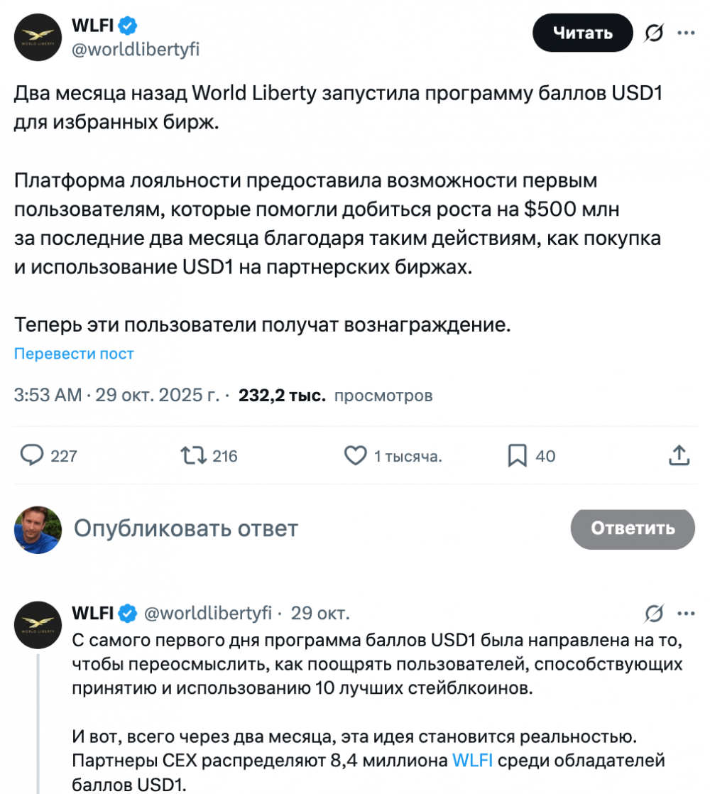 Аирдроп поощрит пользователей, которые присоединились к программе USD1 Points Program, запущенной два месяца назад для продвижения стейблкоина World Liberty, обеспеченного долларом США. Участники зарабатывали баллы, торгуя парами с USD1 на партнерских биржах и поддерживая балансы.