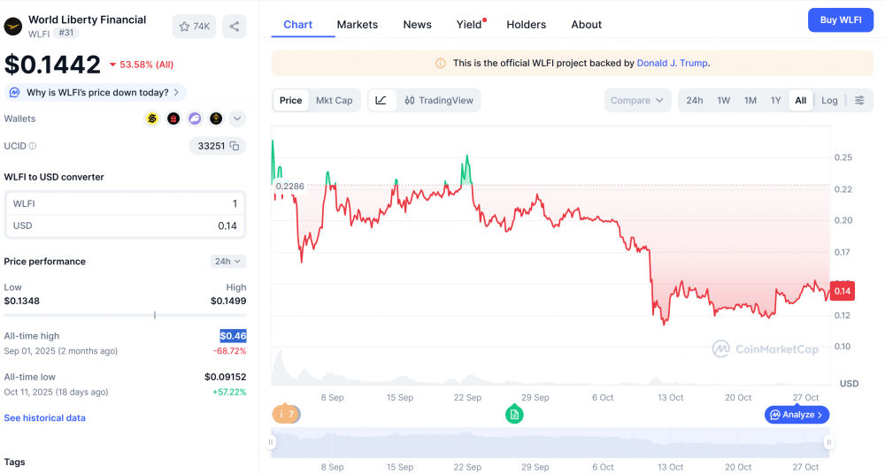 Согласно данным CoinMarketCap, WLFI в настоящее время торгуется на уровне $0,14, потеряв 0,5% за последние 24 часа. Токен упал почти на 70% от своего исторического максимума в $0,46, зарегистрированного в сентябре.