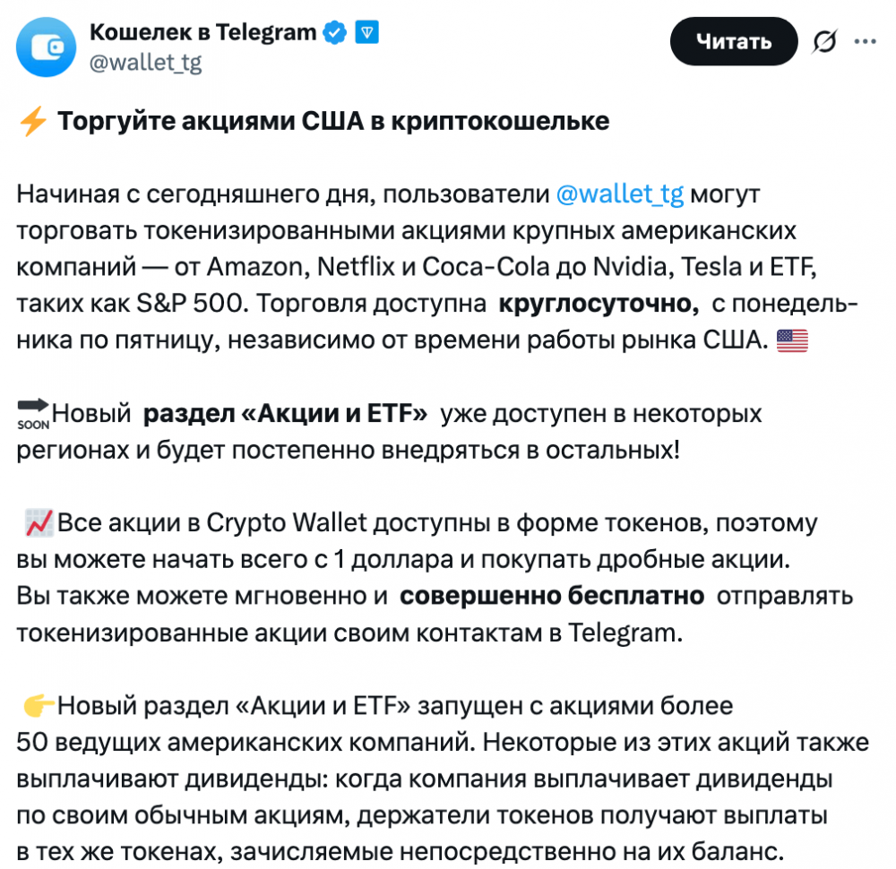 Эти новости появились на фоне запуска токенизированных акций и биржевых фондов от xStocks в приложении Wallet in Telegram, стороннем криптокошельке в Telegram.