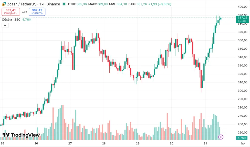 За последние сутки цена актива выросла на 7%, за неделю — на 49%, а за месяц — более чем на 91%. На момент написания Zcash торгуется около $387 — впервые с 2018 года.
