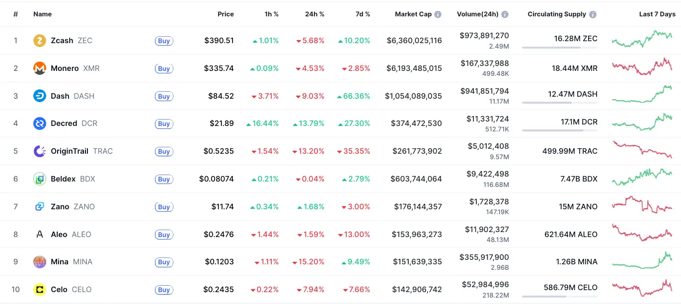 Некоторые ведущие приватные монеты демонстрируют рост вопреки общей тенденции на рынке цифровых активов. Это сигнализирует о растущем спросе инвесторов на криптовалюты с усиленной защитой конфиденциальности.