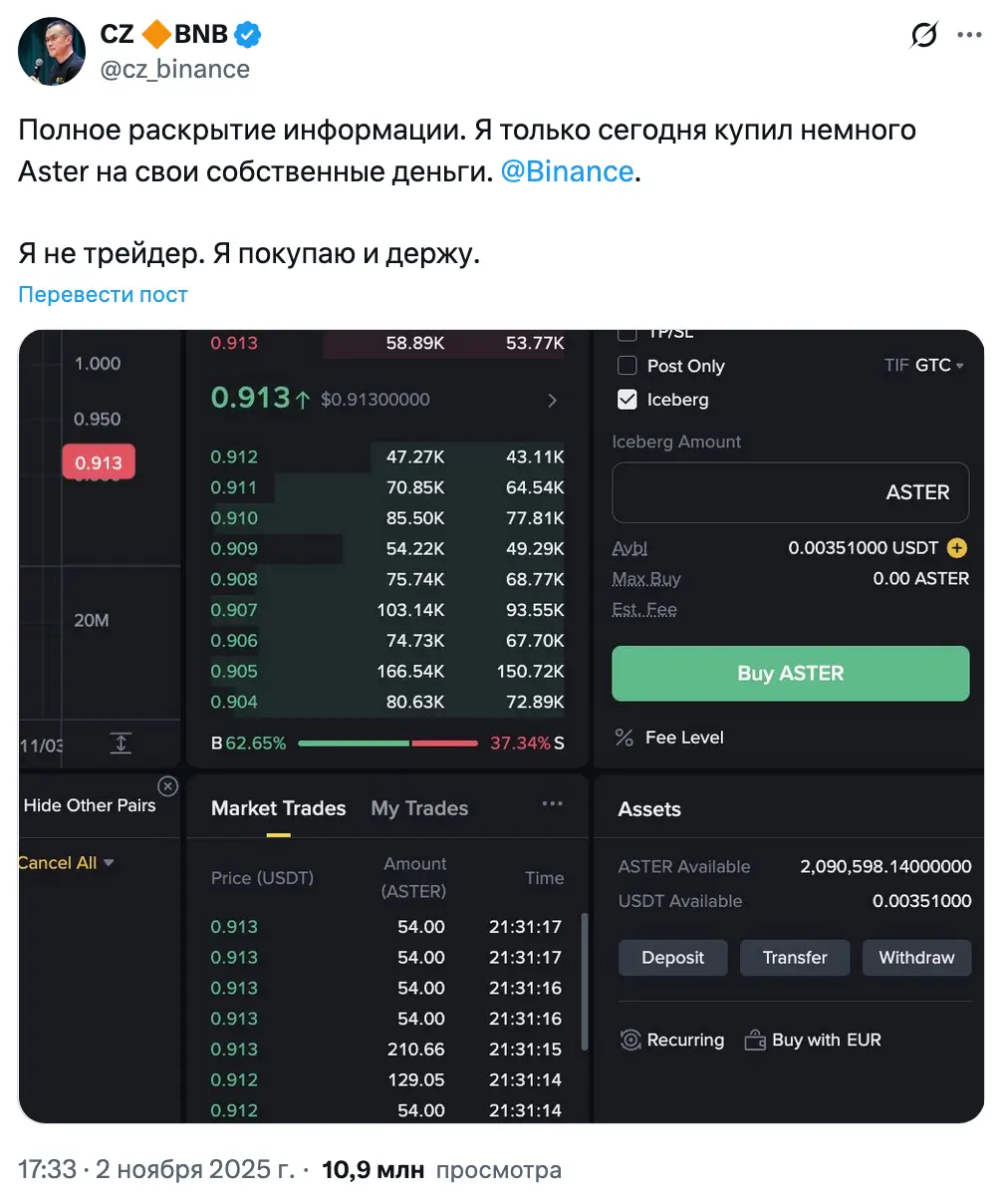 «Чжан, самый влиятельный человек в криптоиндустрии и создатель крупнейшей платформы, объявил о покупке ASTER на личные средства. Это все. Не усложняйте», — добавил он.
