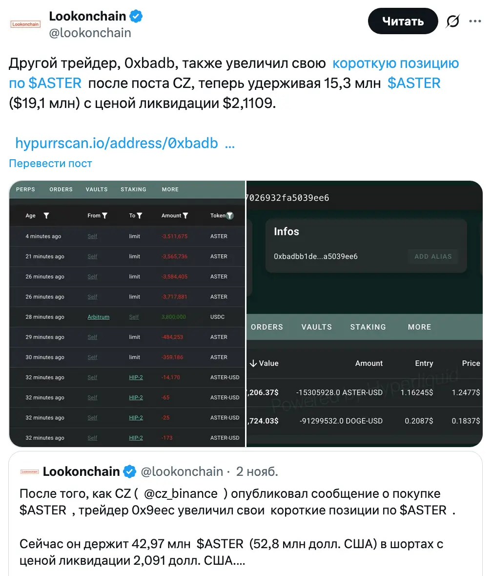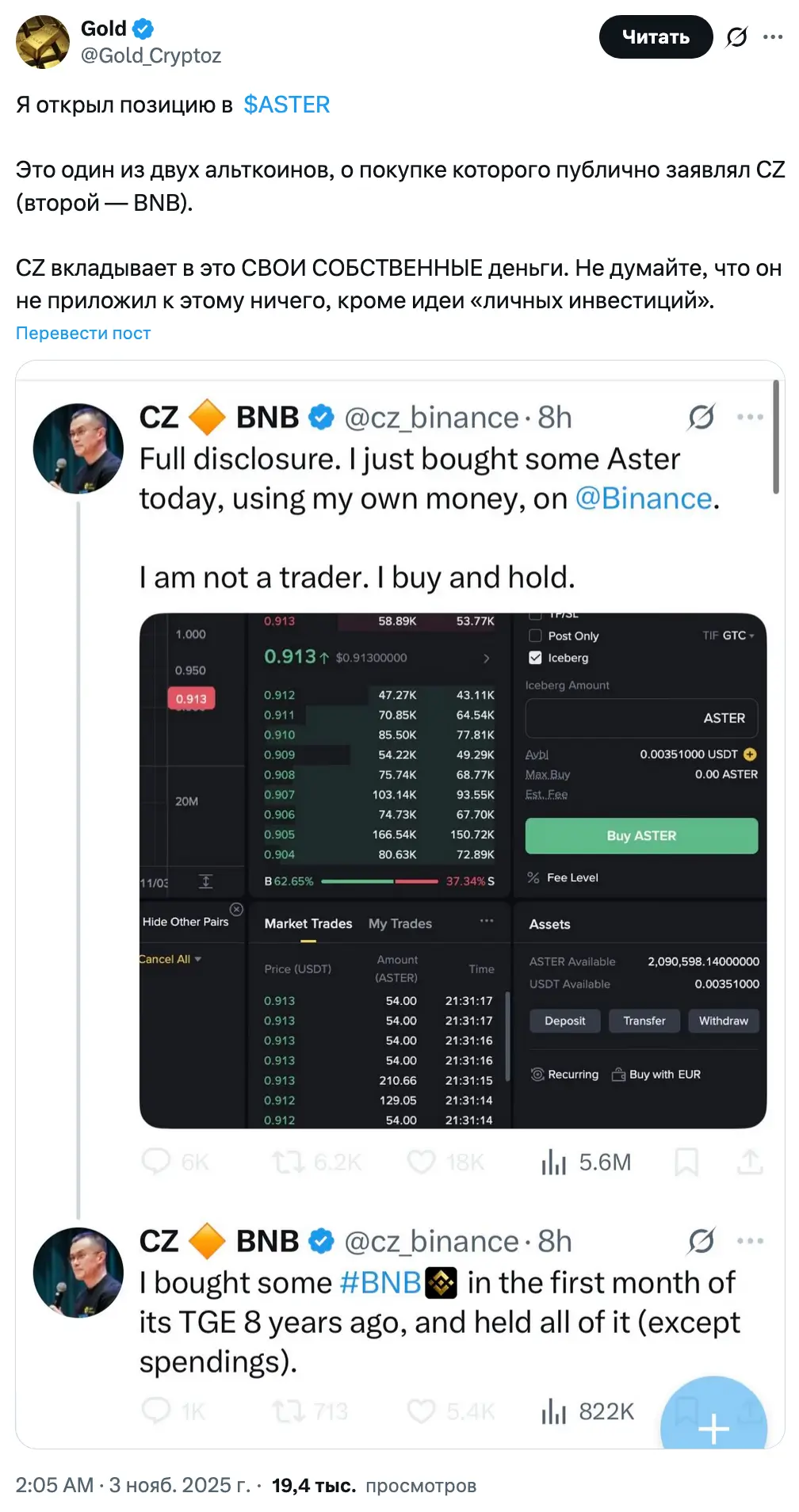 Трейдер под псевдонимом Gold объявил в социальной сети X об открытии позиции в Aster после публикации Чжао, пояснив, что это первый случай, когда Чжао анонсировал покупку токена за пределами BNB.
