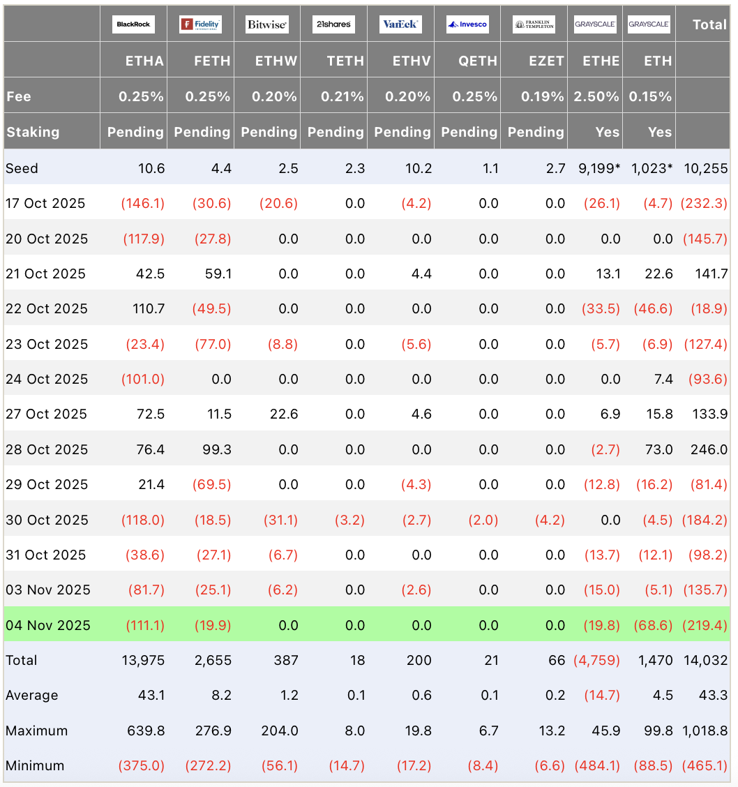 Продукты Fidelity FETH и BlackRock ETHA стали основными источниками оттока. За пять дней из Ethereum-ETF ушло почти $1 млрд, что продолжает негативную динамику с конца октября.