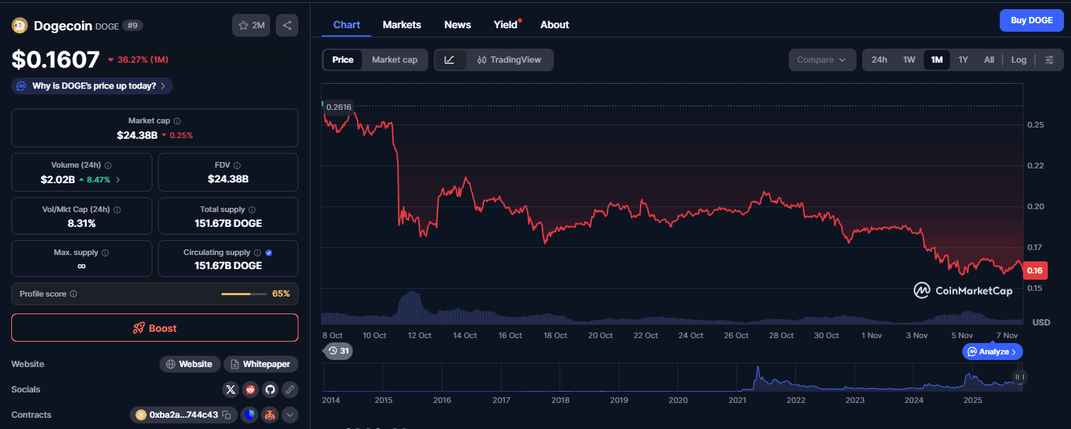 На момент подготовки новости курс Dogecoin держится на отметке $0,1607, по данным CoinMaketCap. Рыночная капитализация актива составляет $24,38 млрд.