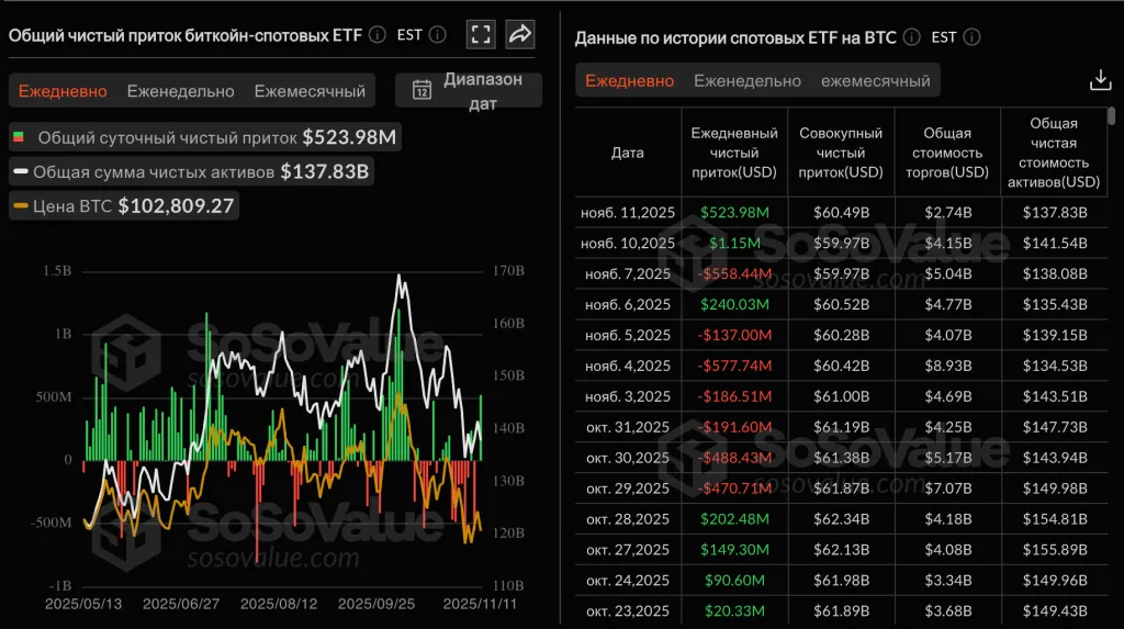 Инструменты на базе первой криптовалюты привлекли $523 млн, доведя общий чистый приток до $60,4 млрд.