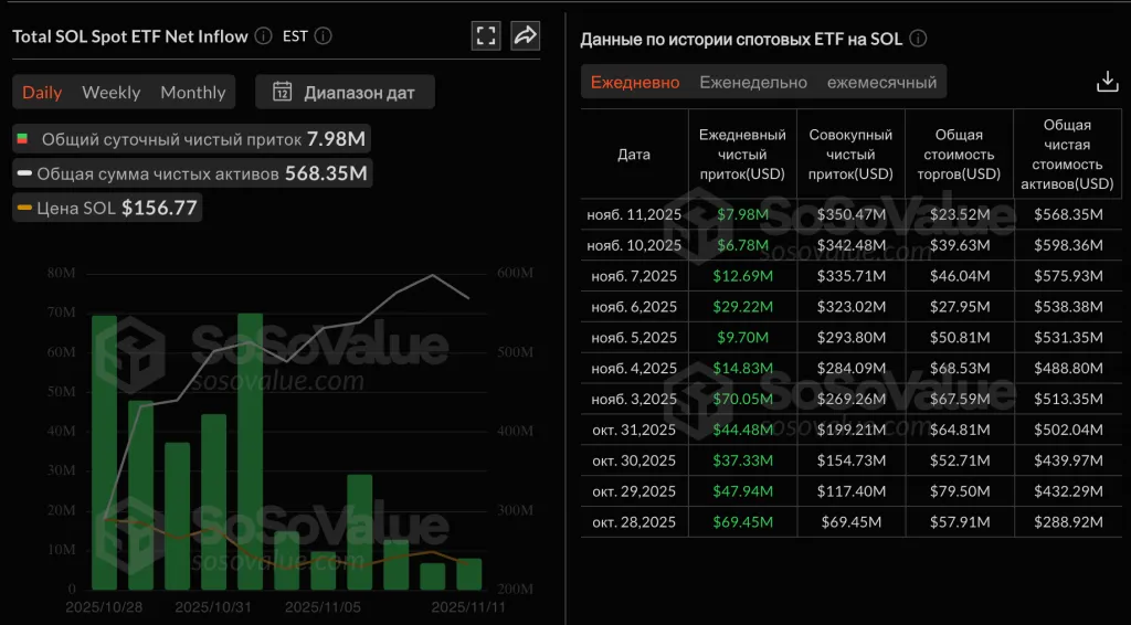Большая часть поступлений пришлась на GSOL от Grayscale — $5,9 млн. Результат BSOL от Bitwise — $2 млн.