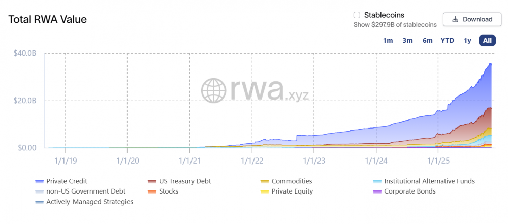 Согласно отраслевым данным, общая стоимость токенизированных реальных активов за исключением стейблкоинов выросла до примерно $36,6 млрд. На институциональные фонды приходится около $3 млрд этой суммы, в то время как токенизированные казначейские обязательства США составляют приблизительно $8,4 млрд.