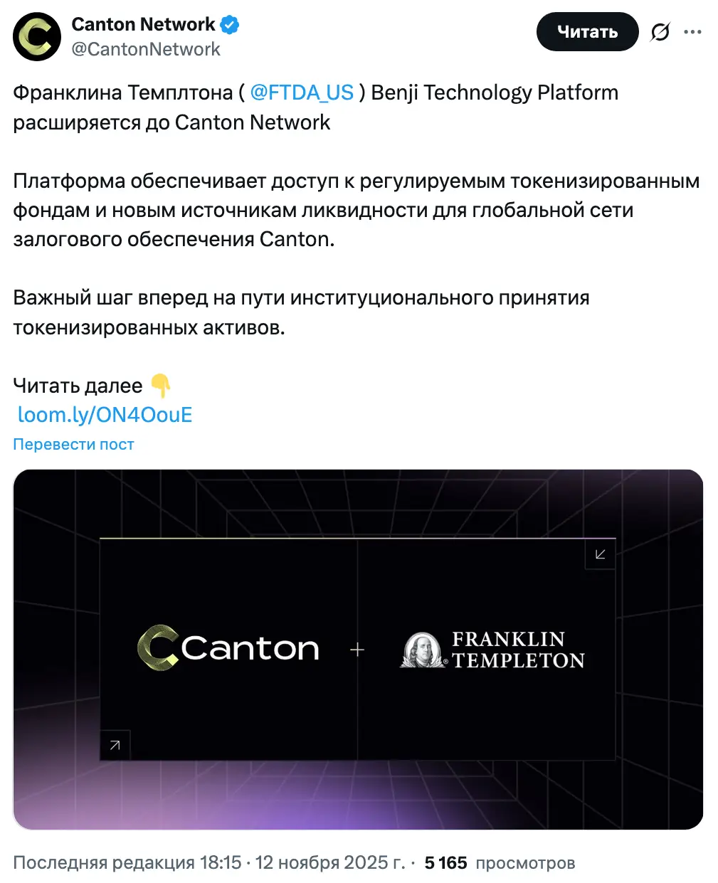 Присоединяясь к Canton, Franklin Templeton добавляет регулируемые инвестиционные продукты в блокчейне к растущему перечню токенизированных инструментов в сети, дополнительно сокращая разрыв между традиционными финансами и рынками цифровых активов.