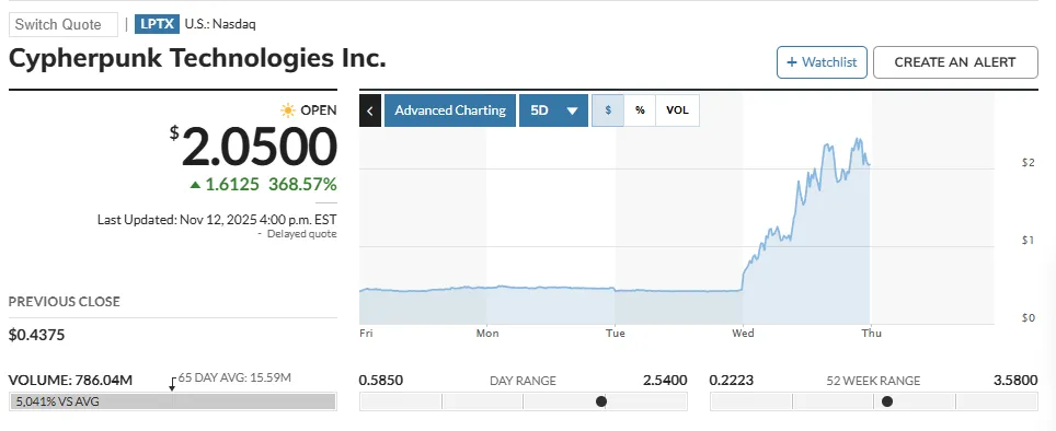 После анонса начала накопления Zcash котировки акций Cypherpunk выросли на 368% за прошедшую торговую сессию.