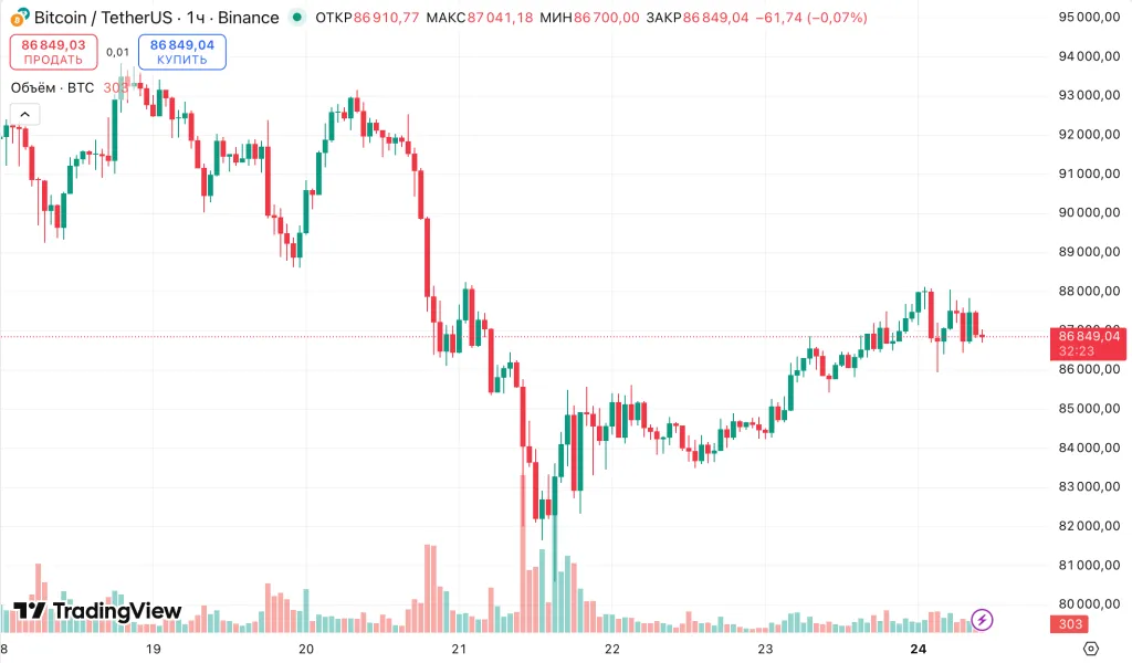Цена биткоина просела на 22% за аналогичный период — со ~$115 000 до ~$86 800.