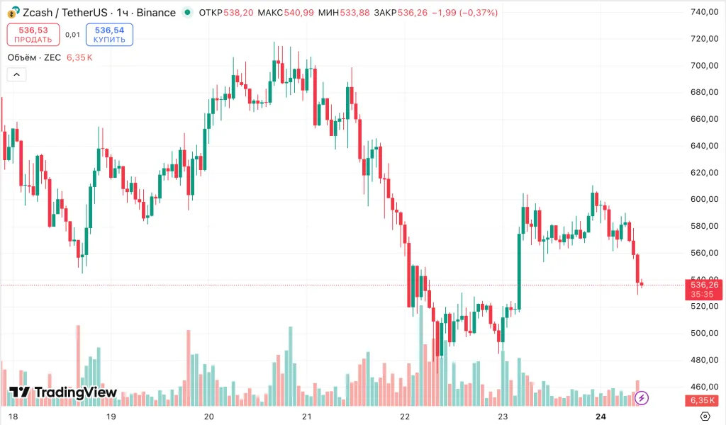 За последний месяц котировки токена выросли почти на 100%. На пике цена превышала $720. На момент написания цена ZEC составляет ~$530.