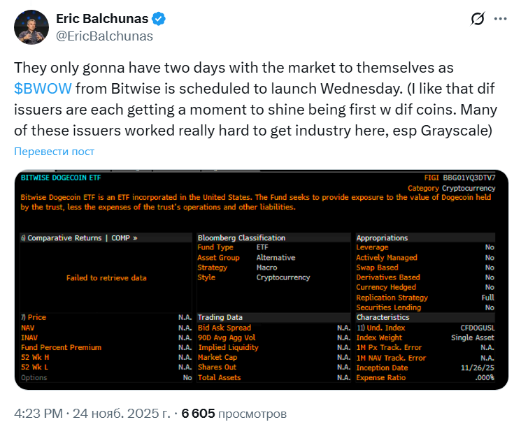 Bitwise запустит конкурирующий продукт под тикером BWOW 26 ноября. Балчунас отметил, что разные эмитенты получают возможность первыми выходить на рынок с различными монетами, что способствует развитию индустрии.