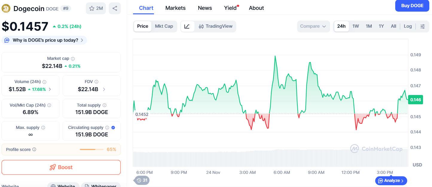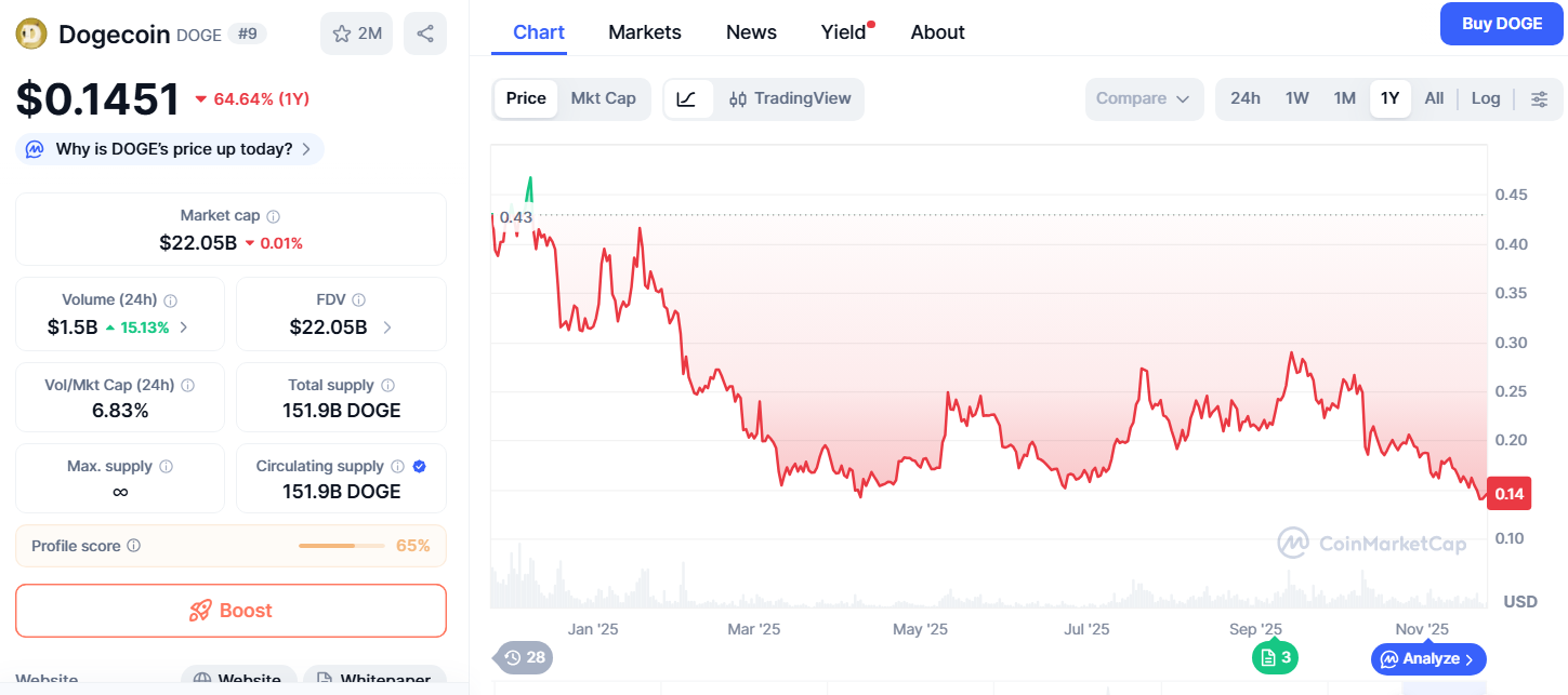 Запуск ETF пока никак не отразился на цене Dogecoin (DOGE). Криптовалюта по-прежнему торгуется более чем на 80% ниже исторического максимума.