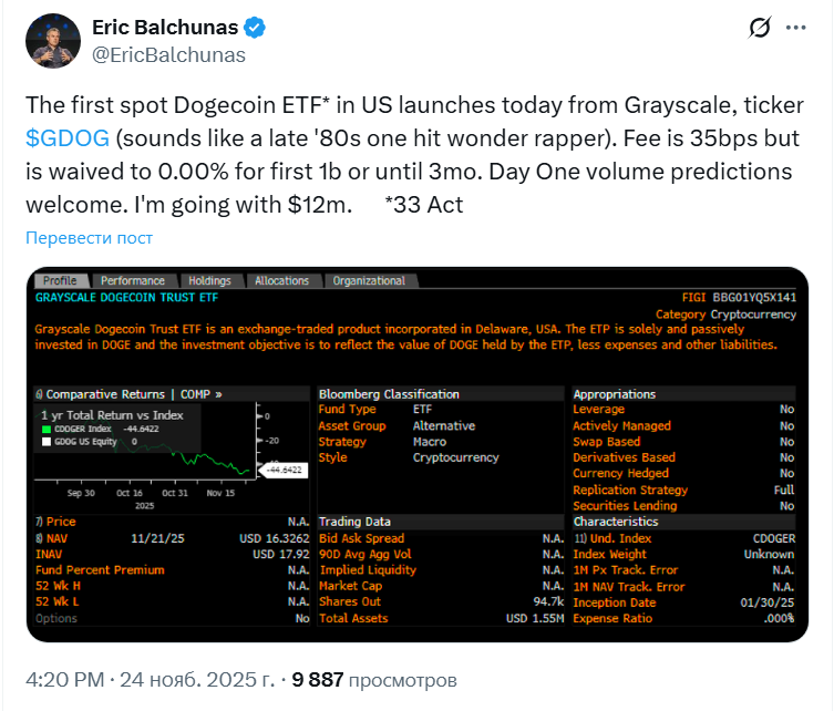 Крупнейший управляющий активами Grayscale Investments запустил первый в США спотовый ETF на базе мемкоина Dogecoin. Фонд под тикером GDOG начал торговаться на бирже NYSE Arca 24 ноября.