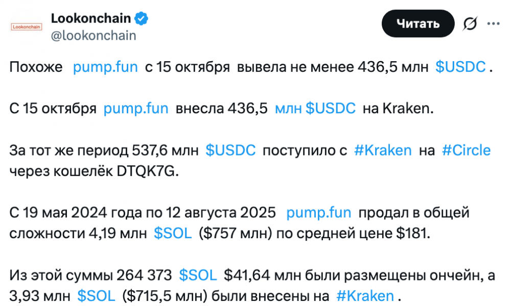Комментарии Сапиджиджу последовали после отчета Lookonchain о переводе $436 млн в USDC на биржу Kraken с кошельков, связанных со стартовой платофрмой мемкоинов на Solana. Эти действия восприняли как масштабный вывод средств.