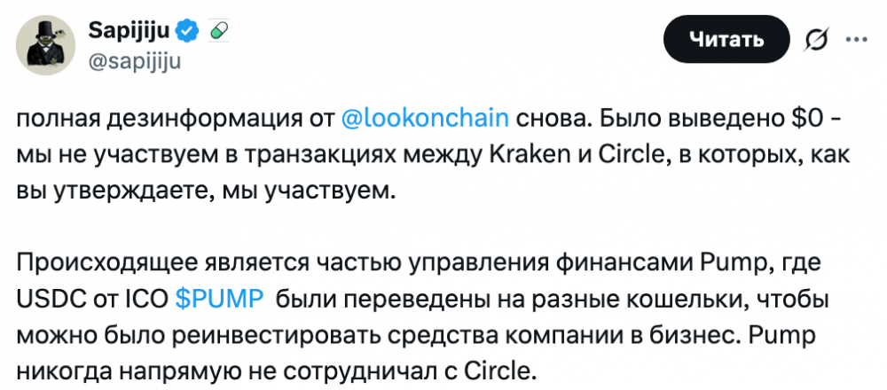 В публикации на X Сапиджиджу ответил на отчет, настаивая, что переведенные средства не были проданы. Он пояснил, что USDC поступили от первичного предложения токена PUMP и просто перераспределены между внутренними кошельками в рамках управления корпоративной казной.