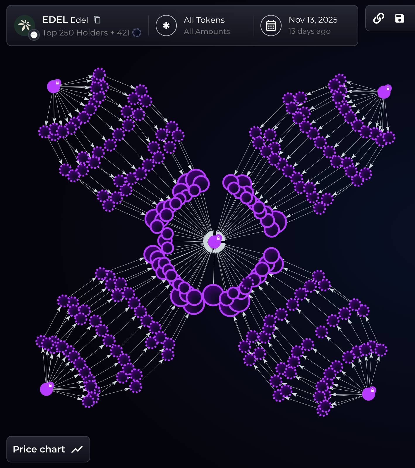 Каждый кошелек получил 50% купленных токенов EDEL, а оставшиеся 50% были распределены примерно по 100 вторичным кошелькам. Все они, как сообщается, были профинансированы через биржу MEXC.