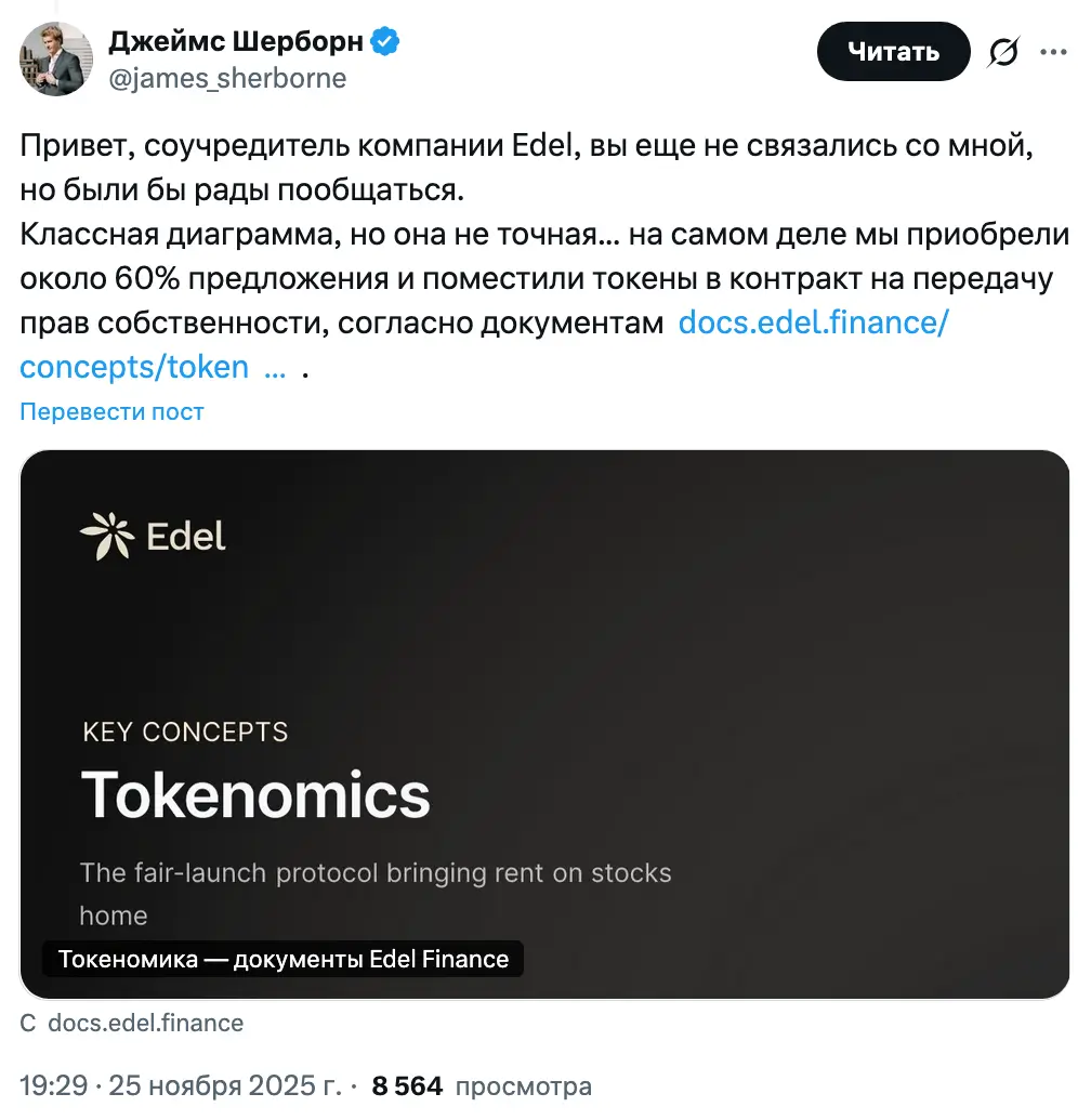 Отвечая на выводы Bubblemaps, Джеймс Шерборн, сооснователь Edel Finance, заявил, что команда планировала приобрести 60% предложения токенов, которые впоследствии были заблокированы в контрактах с постепенной разблокировкой.