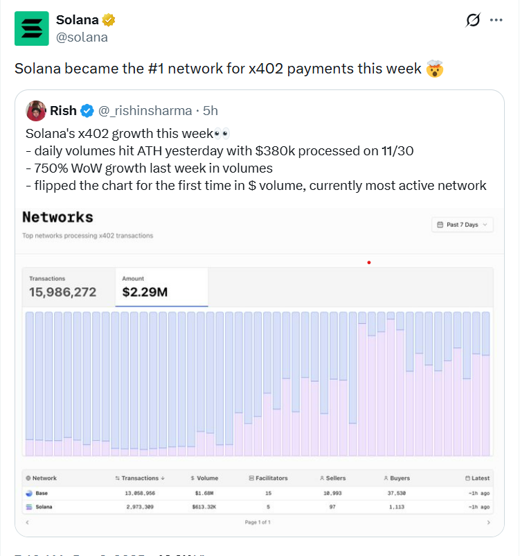 На этой неделе Solana стала сетью №1 для платежей x402. Источник: Solana.