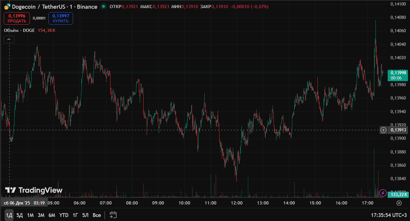 На свой 12-й день рождения Dogecoin торгуется около $0,14 с рыночной стоимостью примерно $22,5 млрд. Монета сохраняет место в топ-10 криптоактивов, несмотря на коррекцию 3,1% за сутки на фоне общего снижения рынка.