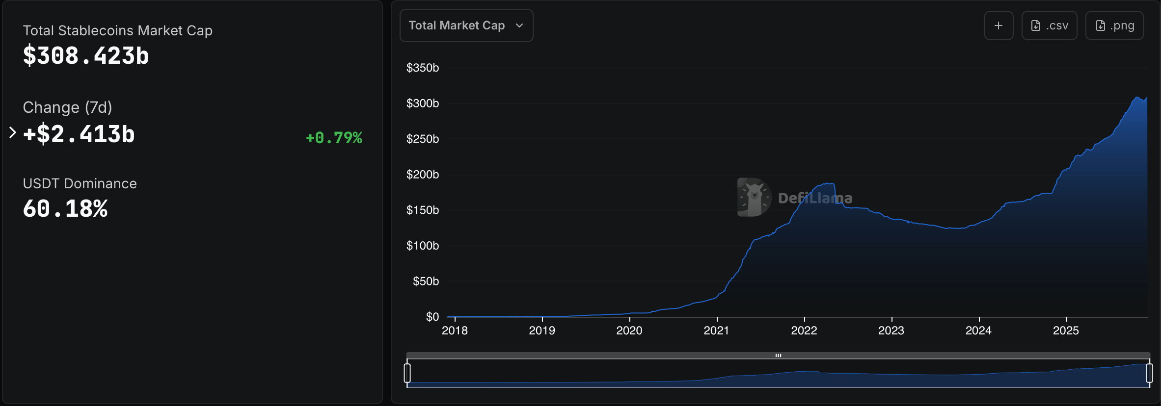 Согласно данным DefiLlama, капитализация рынка стейблкоинов выросла примерно до $308,45 млрд по сравнению с $198,76 млрд годом ранее. Это означает рост на 55% за указанный период.