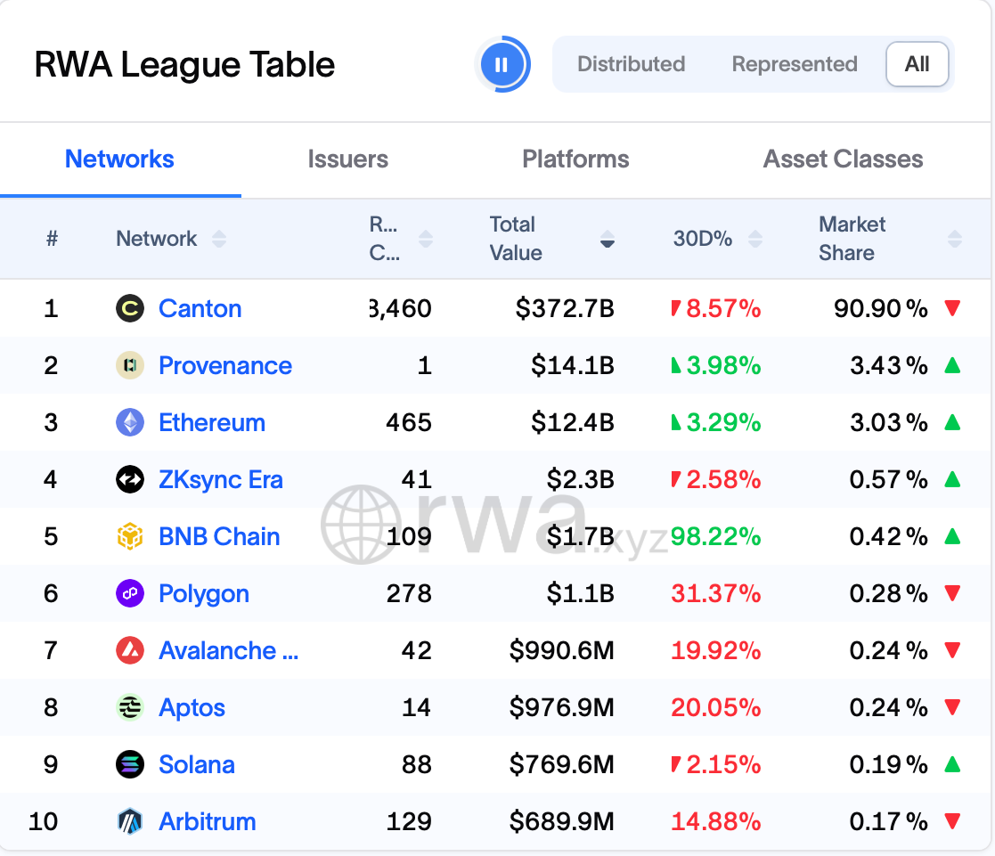 Данные RWA.xyz показывают: Canton Network сейчас лидирует на рынке токенизированных реальных активов с большим отрывом. На сети представлено более $370 млрд, что значительно превышает показатели популярных сетей — Ethereum, Polygon, Solana и других публичных блокчейнов.